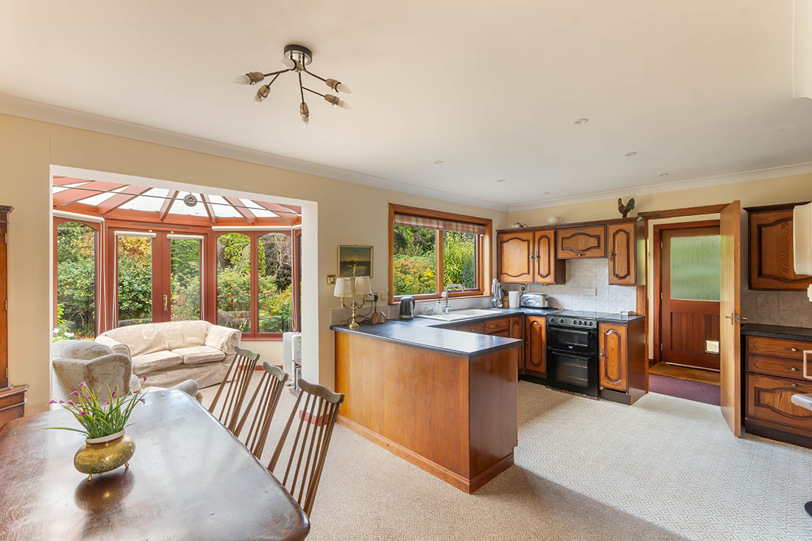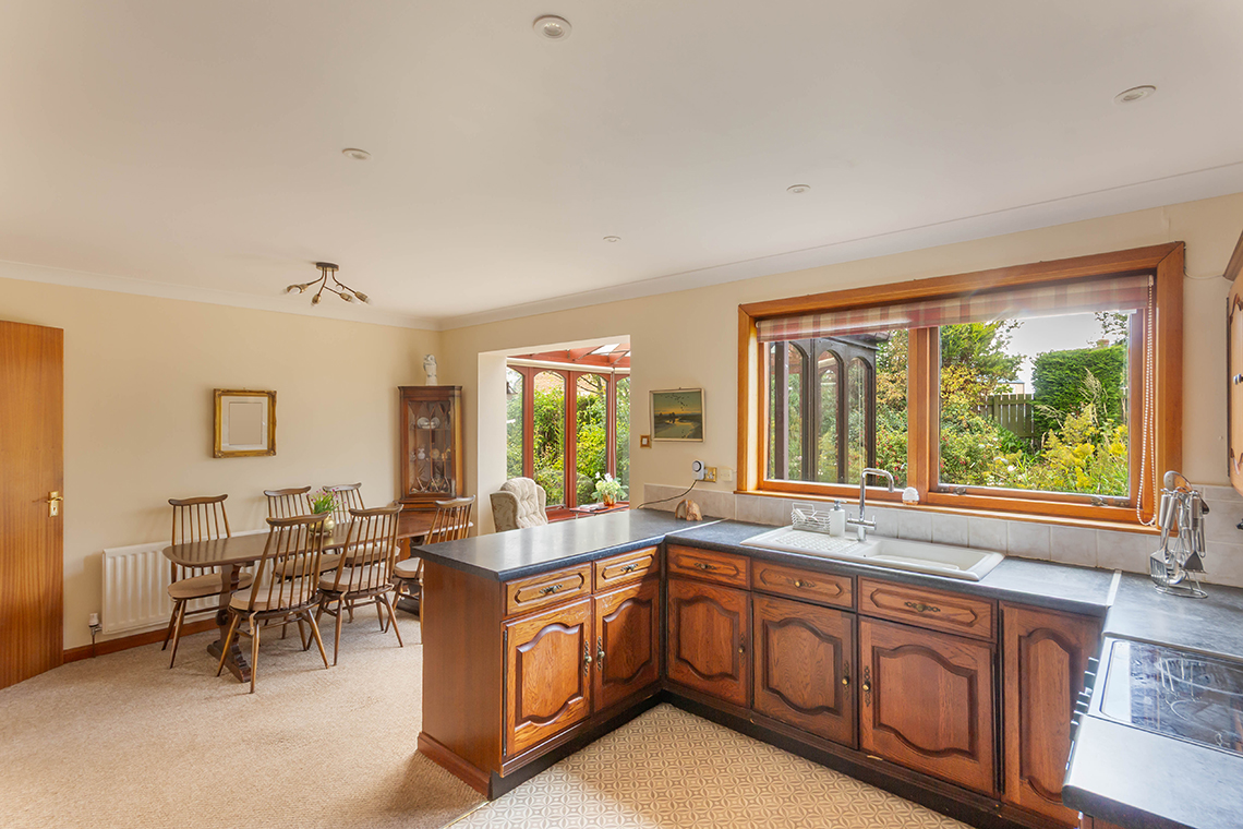 hearth with decorative fireplace | Excellent open plan kitchen /dining room which is also open to the Conservatory at the rear | The family kitchen is fitted with a range of wood cabinets, with space for free