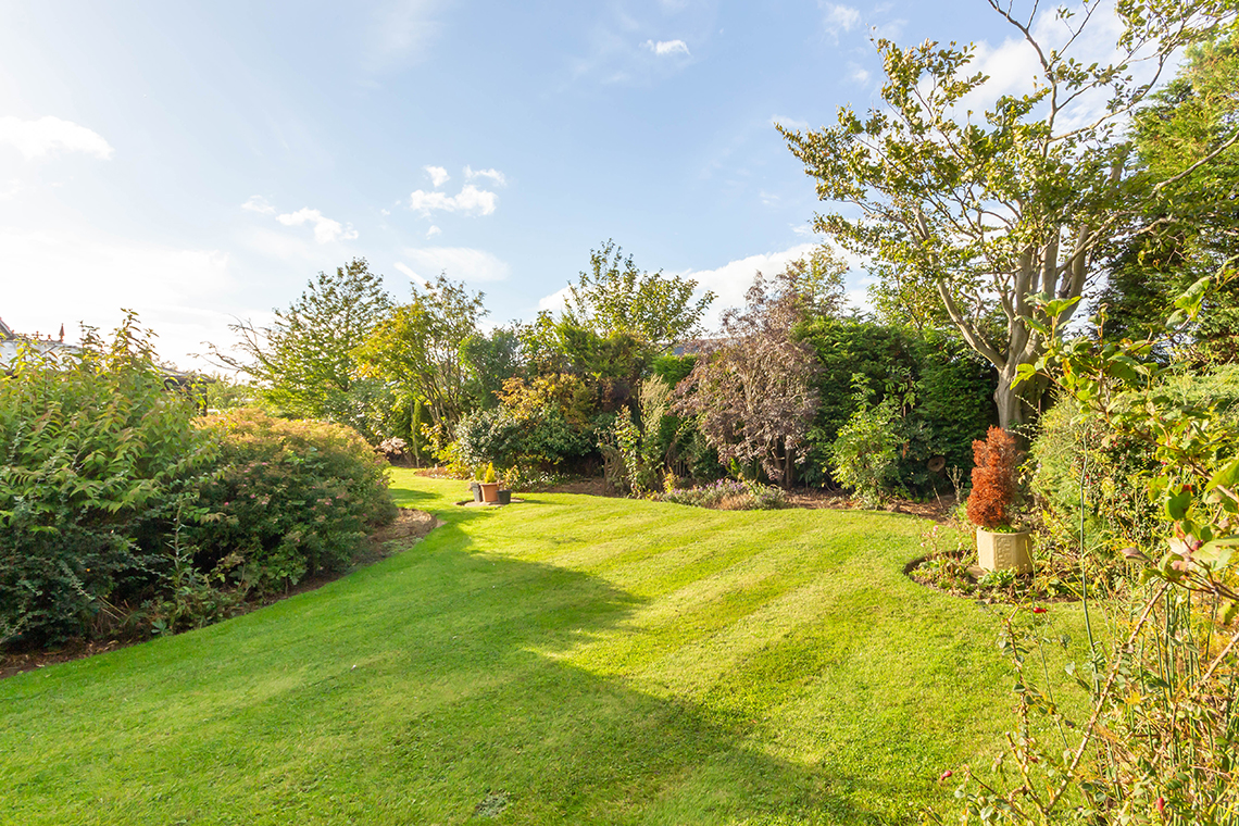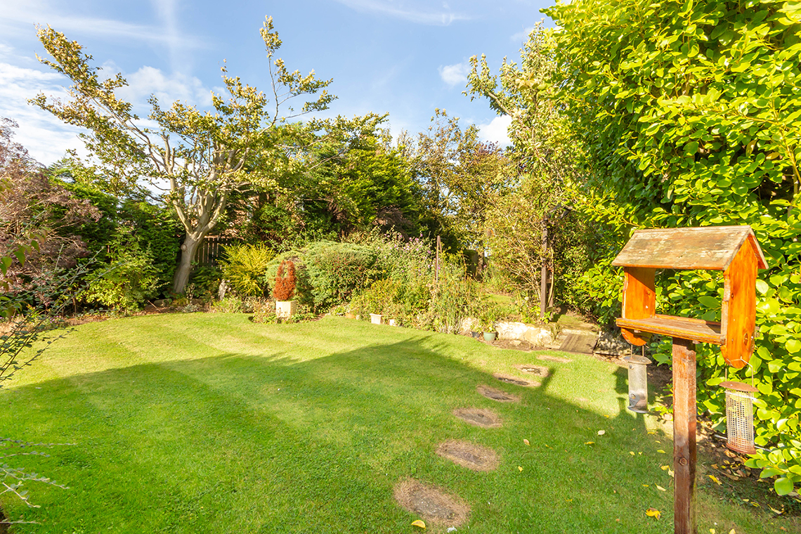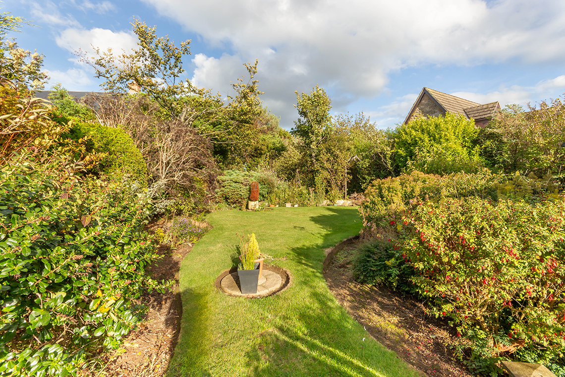 patio running from the conservatory around to the side – there are lawned areas, trees and shrubs giving good privacy, and a ‘secret garden’ to the top northeast corner | Gates to